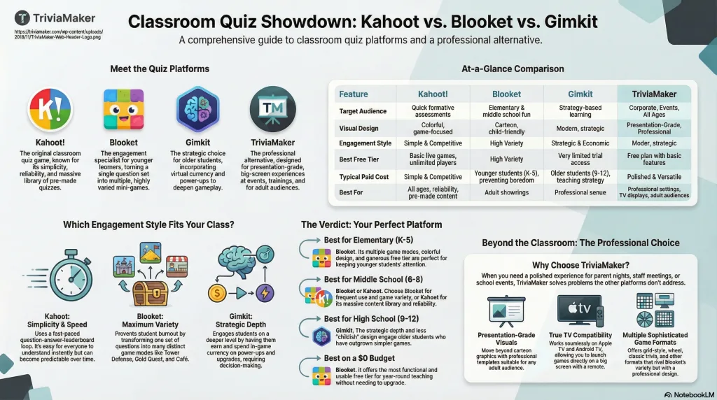While platforms like Kahoot and Blooket dominate classrooms, they often fall short for corporate training, professional events, or older audiences. This guide will not only compare the big three but also introduce you to TriviaMaker, the platform designed for presentation-grade, big-screen quiz experiences that scale.