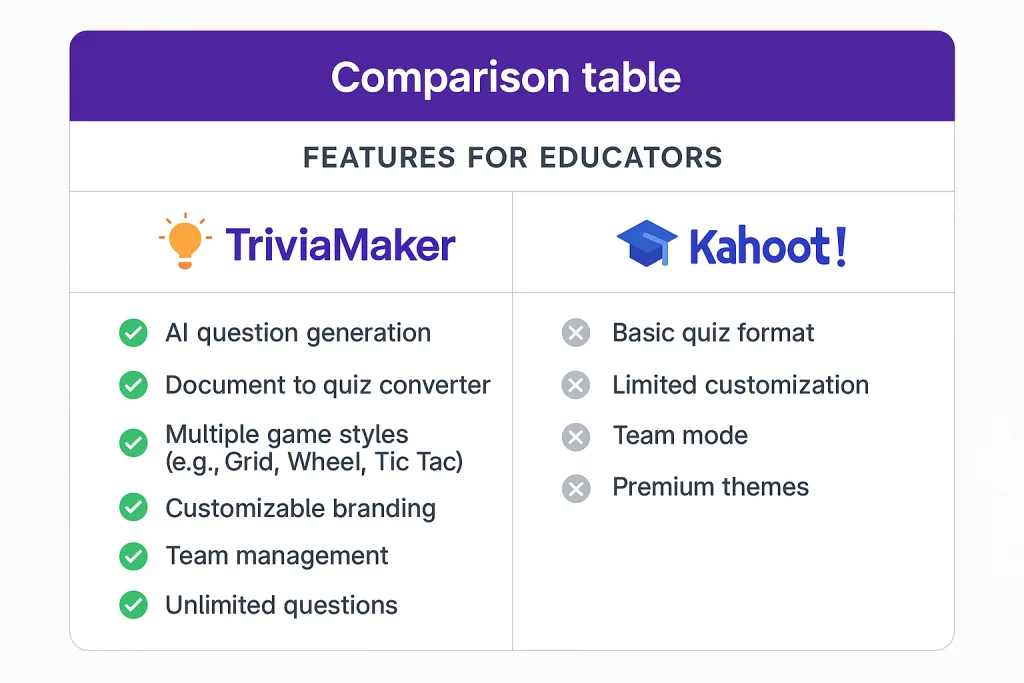 | Feature | Kahoot! | TriviaMaker |