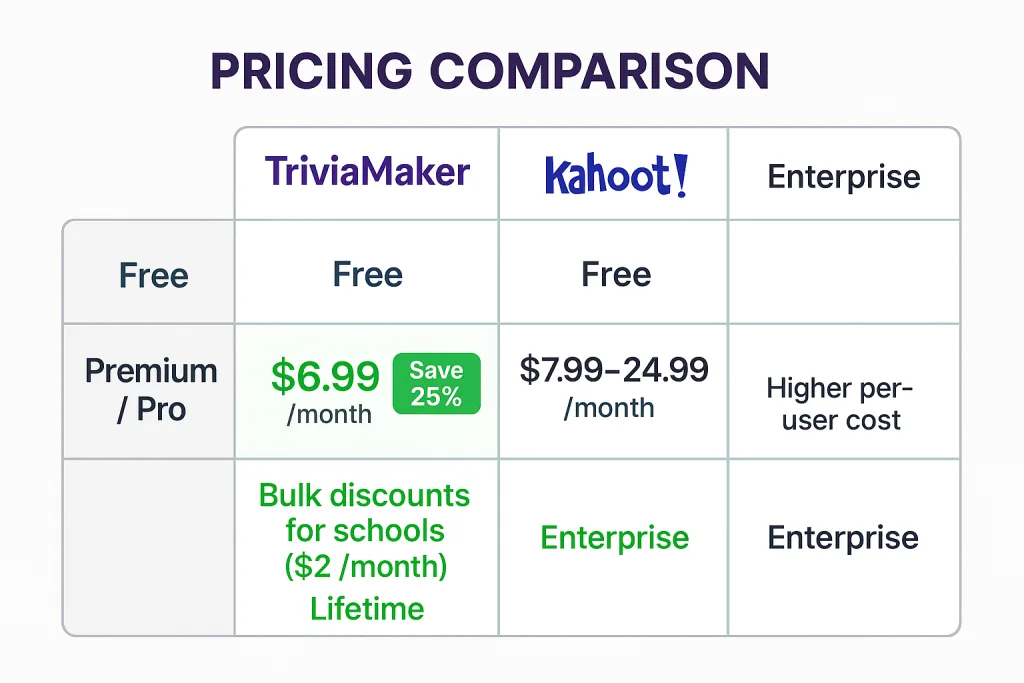 - TriviaMaker offers a very generous free plan that includes access to its core game modes and features. This is often more than enough for casual users or teachers who want to explore its capabilities. For those who need advanced features like custom branding and detailed analytics, the paid plans are competitively priced and offer significant value, especially when compared to the cost of Kahoot’s higher-tier plans. The enterprise options are also designed to be scalable and affordable for large organizations.